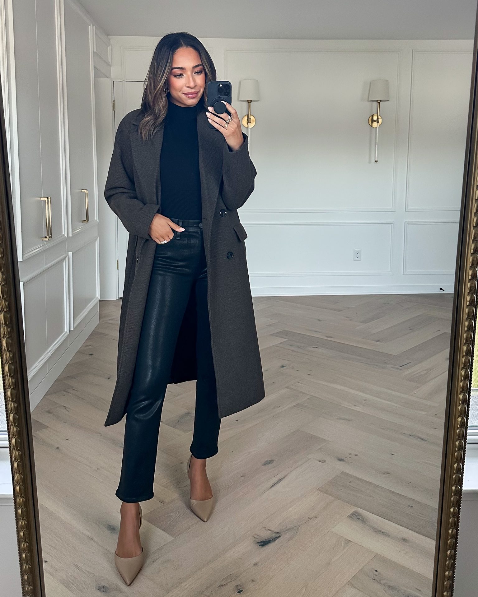 Long Top Coat (Small, oversized fit) || Grey Crewneck Sweater (Small, TTS) || Light Wash Denim (25, run large) || Black Suede Ankle Booties (TTS) || Black Sweater Dress (Small, TTS) || Mock Neck Top (XXS, runs large) || Black Coated Jeans (26, TTS) || Nude Pumps (TTS)