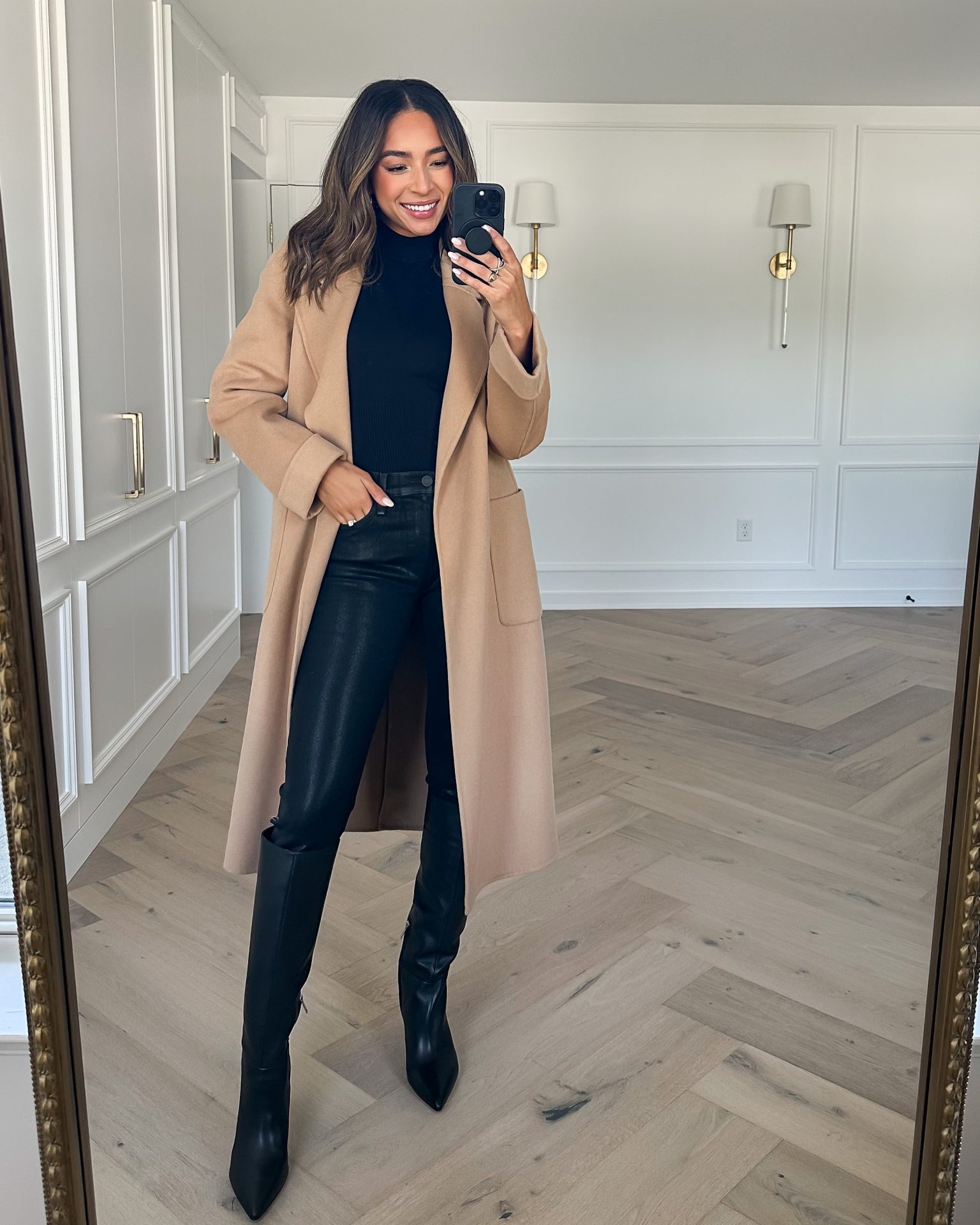Black Coated Denim (26, TTS) || Mock Neck Top (XXS, runs large) || Knee High Boots (TTS) || Striped Sweater (XS, runs large) || Black Suede Ankle Booties (run small) || Tan Wool Coat (4, runs small)