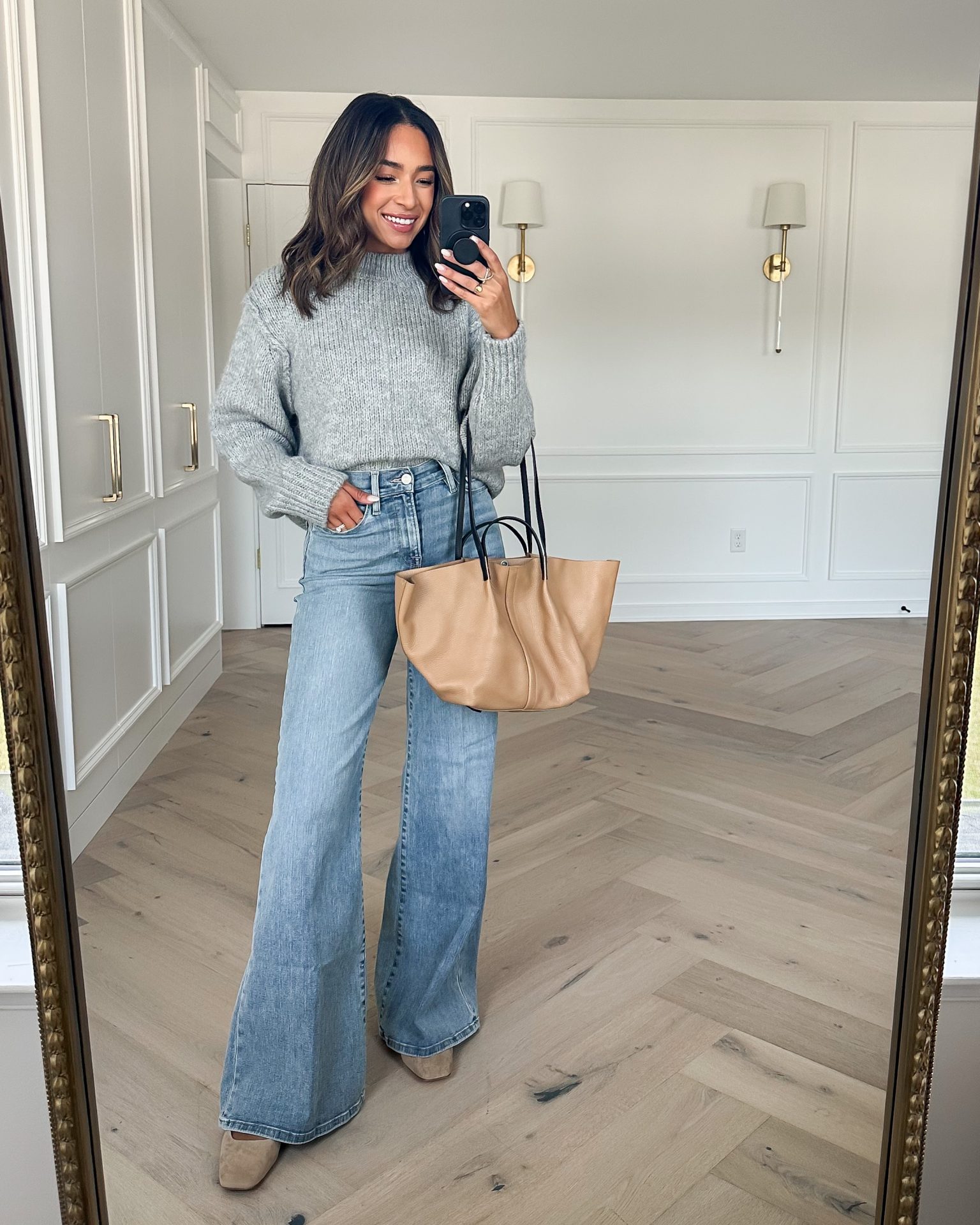 Grey Crewneck Sweater (Small) || Nude Square Toe Flats (TTS) || Wide Leg Jeans (26, TTS) || Faux Leather Jacket (Small, boxy/cropped fit) || Suede Ankle Booties (run small) || Beige Cardigan (Small, TTS)